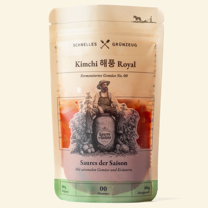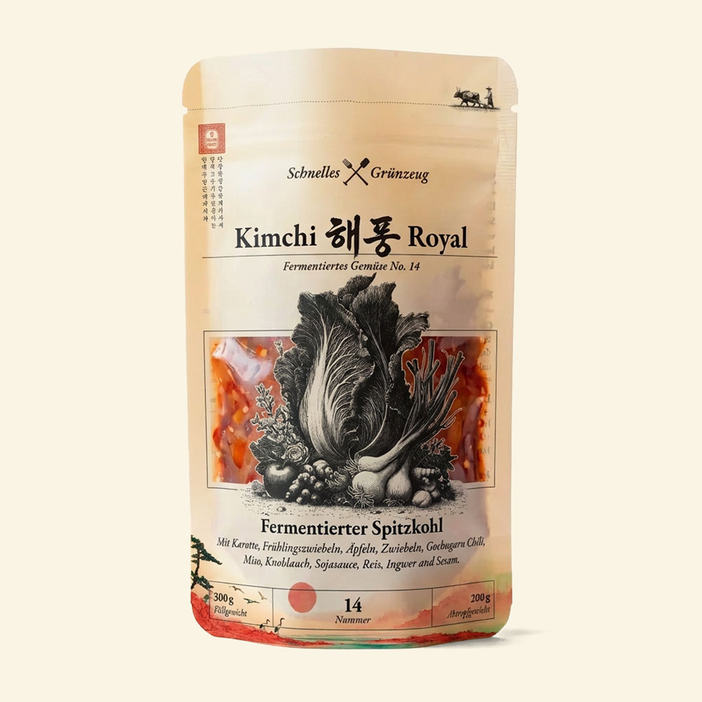 Das Kimchi 해풍 Royal ist der bisherige Höhepunkt meines fermentierenden Schaffens. Dieses Kimchi ist der perfekte Mix aus Kompetenz und kulinarischer Exzellenz. Neben meinem Wissen und dem von Bini Lee, meiner Freundin und kulinarischen Botschafterin Südkoreas, stecken die edelsten Zutaten drin, die es in Deutschland gibt: unter anderem Sojasauce und Miso von den hochgeschätzten mimi-ferments aus Berlin.