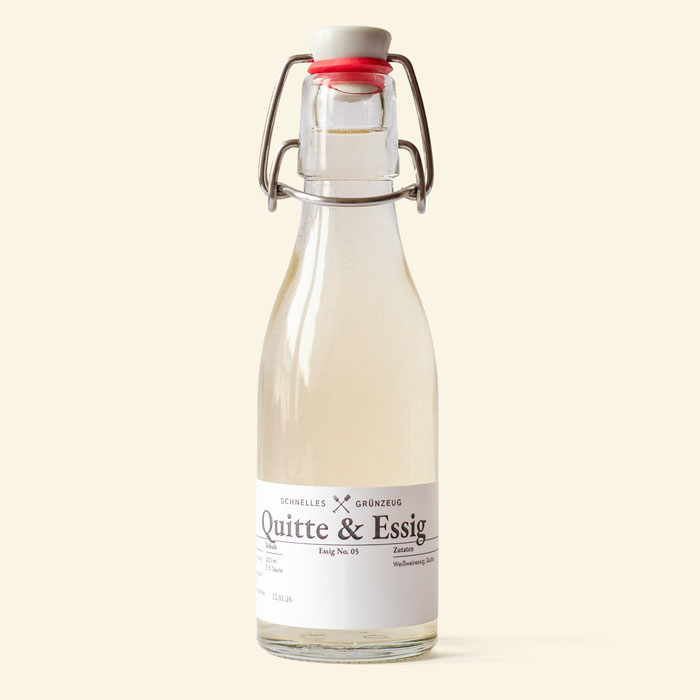 Die vollreifen Quitten aus unserem Dorower Garten haben wir fein gerieben und dann mit bestem Weißweinessig angesetzt. Über viele Wochen geht das herrliche Quittenaroma dann über in diesen Essig.