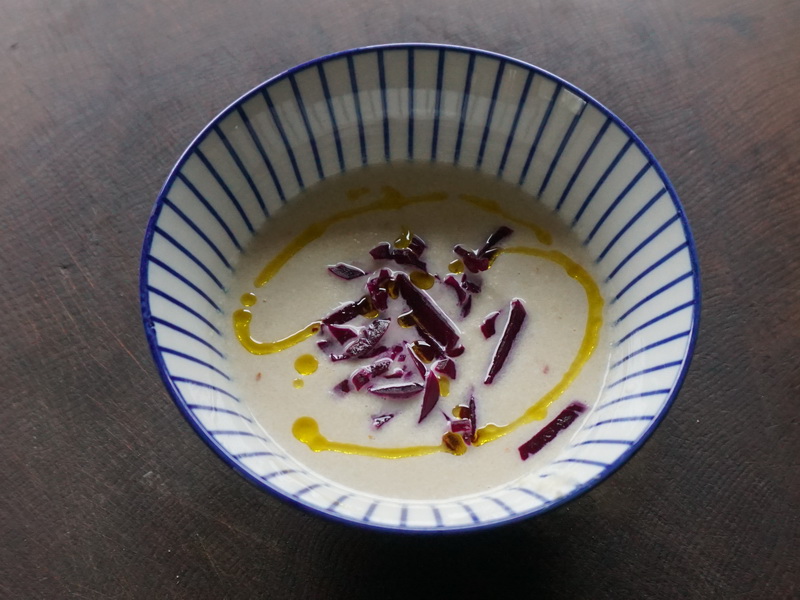 Kalte Suppe aus Sellerie und Mandeln mit fermentiertem Gemüse
